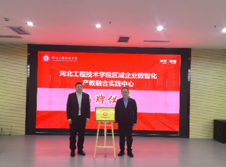 随后,安黎哲校长发表致辞。他指出,河北工程技术学院作为致力于服务地方的应用型大学,始终将人才培养与区域发展需求紧密结合。此次区域企业数智化产教融合实践中心的成立,是学校响应数智化时代号召、深化教育教学改革的重要举措,将为学校高素质应用型人才培养注入新的动力,为服务区域产业升级搭建重要平台。 新道科技股份有限公司助理总裁许鹏在致辞中表示,新道科技长期深耕校企合作与数智化人才培养领域,此次与河北工程技术学院的深度携手,是双方优势互补、资源共享的重要实践。未来,企业将充分发挥在技术、产业资源等方面的优势,与学校共同推动实践中心建设,助力人才培养与产业需求精准对接。 紧接着安黎哲校长与许鹏总裁共同上台,为 “区域企业数智化产教融合实践中心” 揭牌,标志着实践中心正式投入建设与运行。