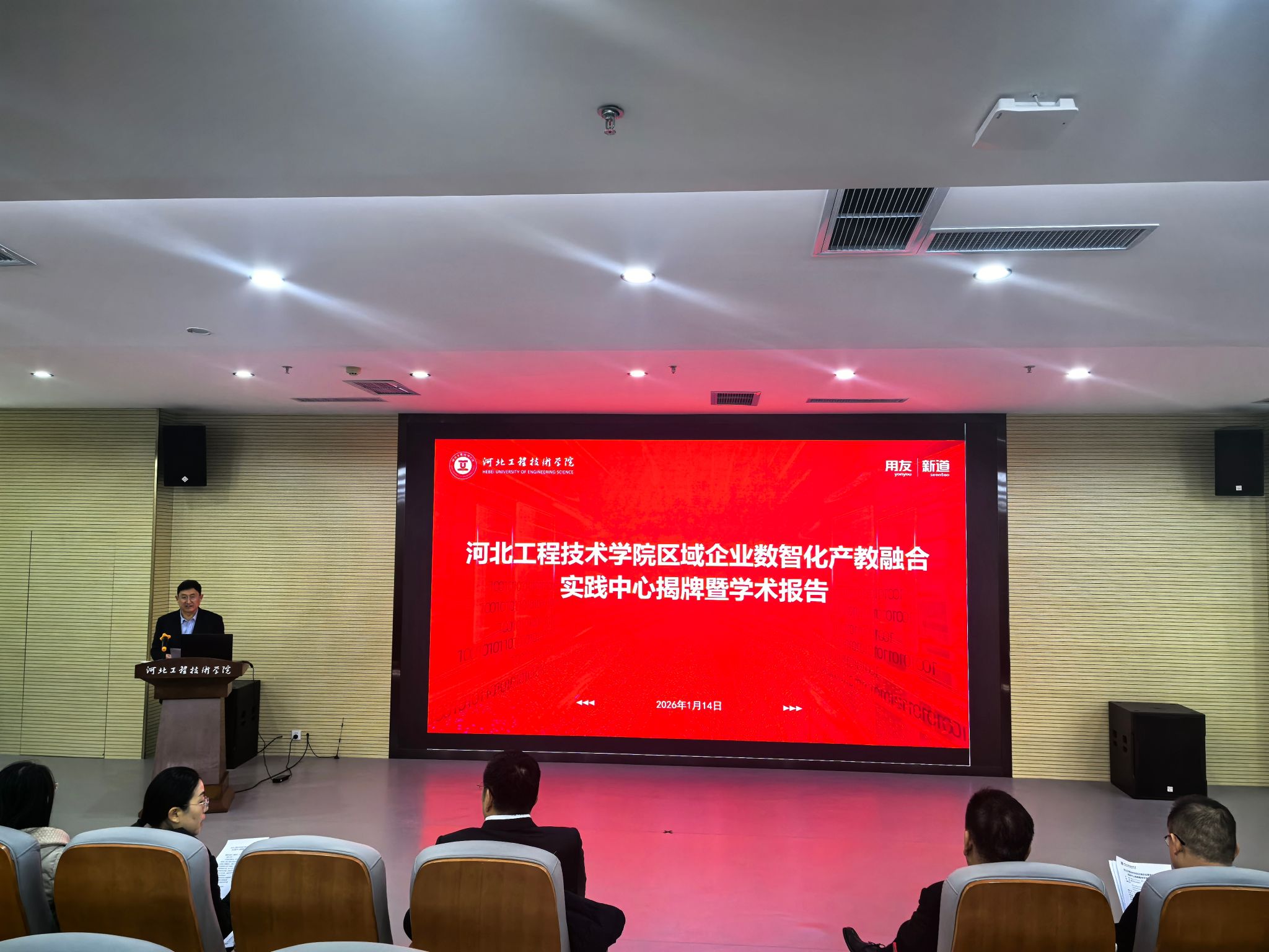 2026年1月14日上午,河北工程技术学院区域企业数智化产教融合实践中心揭牌仪式暨学术报告会在学校图书馆 5 楼放映厅隆重举行。这一重要活动标志着该校在深化产教融合、探索数智化人才培养新路径、服务区域经济高质量发展方面迈出了坚实步伐。河北工程技术学院校长安黎哲,新道科技股份有限公司助理总裁许鹏、首席专家梁峰、校企合作总监杨艺及商学院全体教师齐聚现场,共同见证这一历史性时刻。