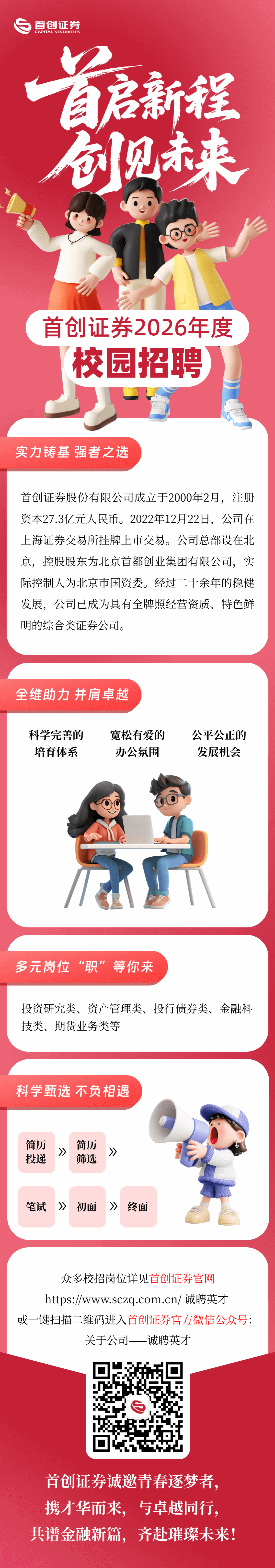 首创证券股份有限公司成立于2000年2月,注册资本27.3亿元人民币。2022年12月22日,公司在上海证券交易所挂牌上市交易(证券代码“601136”)。公司总部设在北京,控股股东为北京首都创业集团有限公司,实际控制人为北京市国资委。现因公司业务发展需要,特招聘品学兼优、有志于投身证券行业的在校学生。公司将以完备的人才管理体系,为员工提供宽松有爱的办公氛围和公平公正的发展机会。